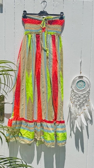 Vestido de algodón con escote palabra de honor en tonos fluor