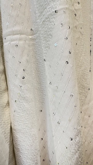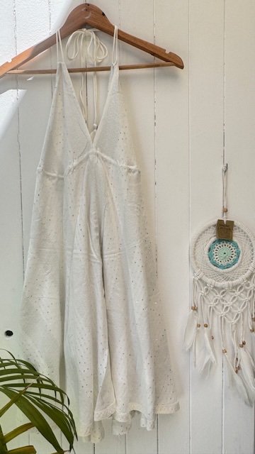 Vestido corto blanco con lentejuelas, anudado al cuello y espalda al aire.