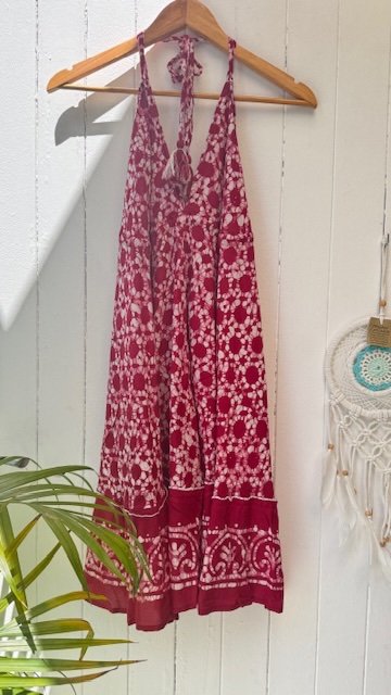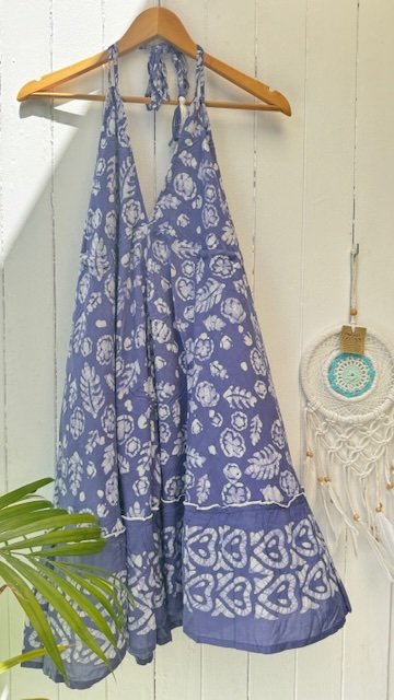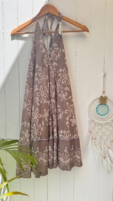 Vestido corto estampado en viscosa anudado al cuello y la espalda al aire