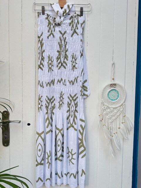 Vestido fruncido hasta la rodilla con lazada en el escote para atar al cuello.